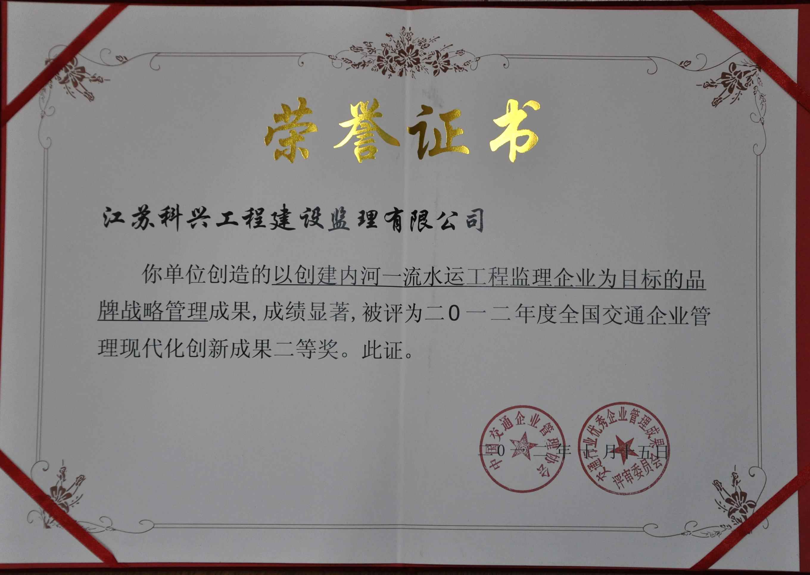 2012年12月1日至2日,2012年全国交通运输企业管理创新年会在北京召开, 公司副总经理张友利参加了会议。会上对2012年度全国交通企业管理现代化创新获奖企业进行了颁奖。其中公司的“以创建内河一流水运工程监理企业为目标的品牌战略管理”成果被评为2012年度全国交通企业管理现代化创新成果二等奖。在此次评选的162项成果中仅有3家监理企业成果获奖。 近年来,公司坚持“以创建内河一流水运工程监理企业为目标”的品牌战略管理,围绕品牌建设,制定创建内河水运工程施工监理品牌企业的战略规划;加快实施内河水运工程人才管理战略;充分发挥国家级科研院所属科技企业优势,创新项目管理机制,建立内河水运施工监理项目管理模版,加强技术研究及总结提炼,促进内河水运建设监理的技术及管理水平提高,为我国内河水运工程建设及行业发展做出贡献;已基本树立内河水运工程施工监理品牌企业的形象。 通过此次获奖,公司进一步在交通行业内展示了自身特色,提高了知名度与影响力。面对成绩,乐鱼(中国)监理公司将戒骄戒躁,与时俱进,团结一致,努力把公司建设成“创新型、学习型、研究型”监理企业。