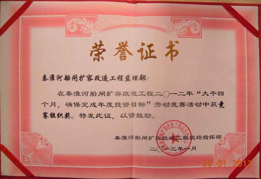 在2012年1月29日秦淮河船闸改造工程指挥部召开的“劳动竞赛表彰大会”中,秦淮河船闸监理部荣获 “竞赛组织奖”。