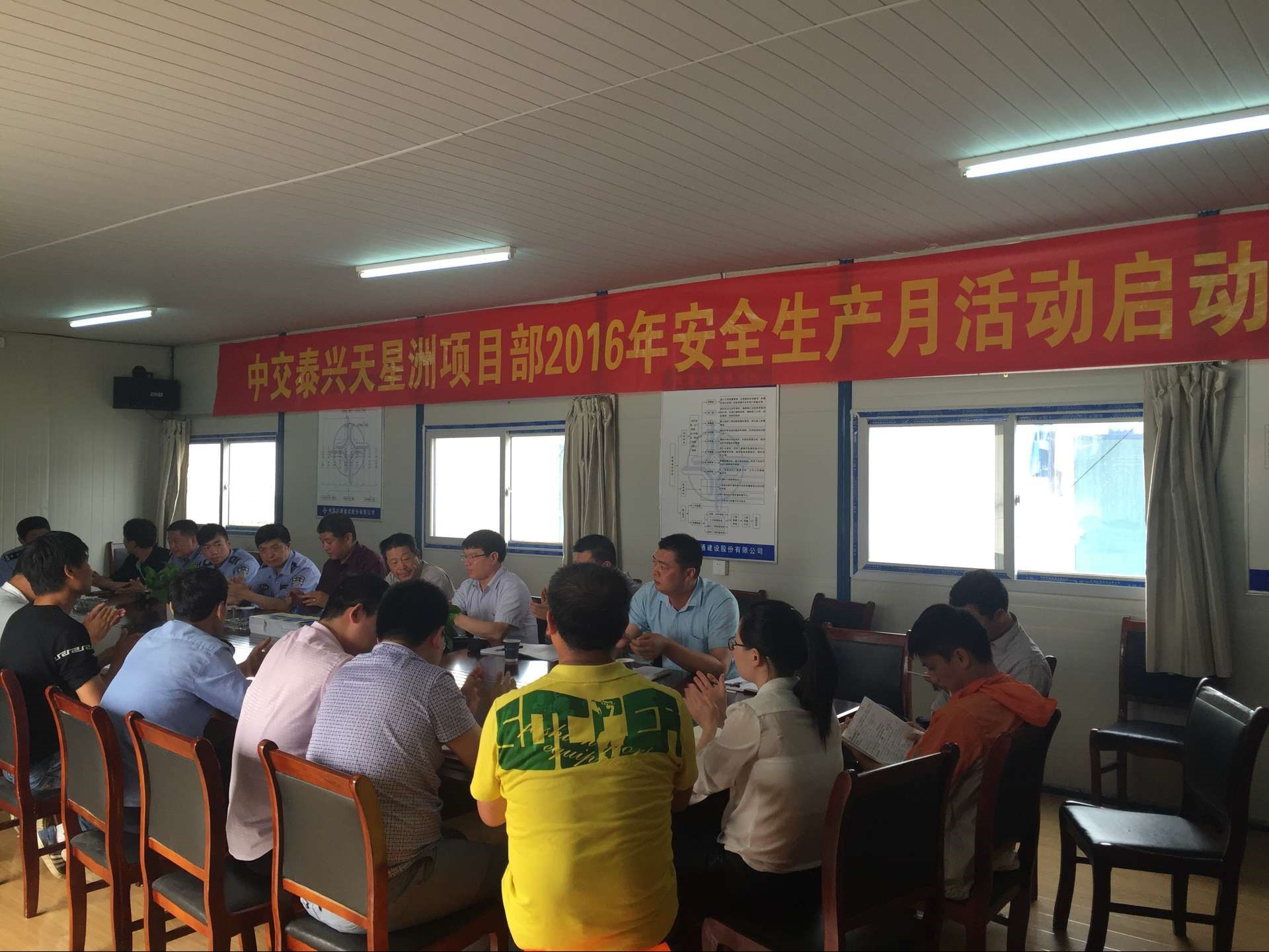为积极响应以“强化安全发展观念,提升全民安全素质”为主题的2016年全国“安全生产月”活动号召,泰兴天星洲项目“安全生产月活动”启动仪式于2016年6月6日下午4时顺利举行。参加此次会议的单位有中交泰兴投资有限公司、泰兴市公安局水上警察大队、天星洲工程项目总监办、天星洲项目部主要负责人及代表。