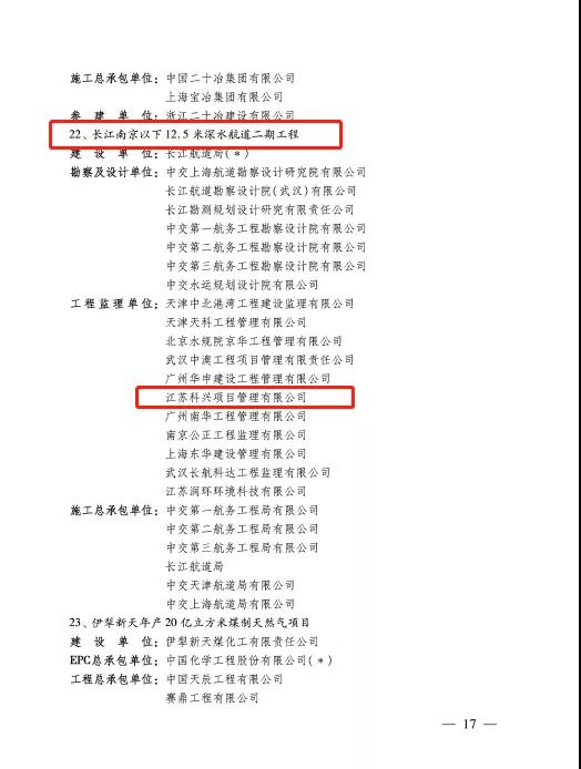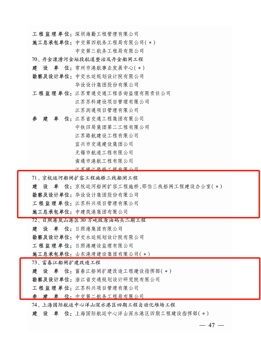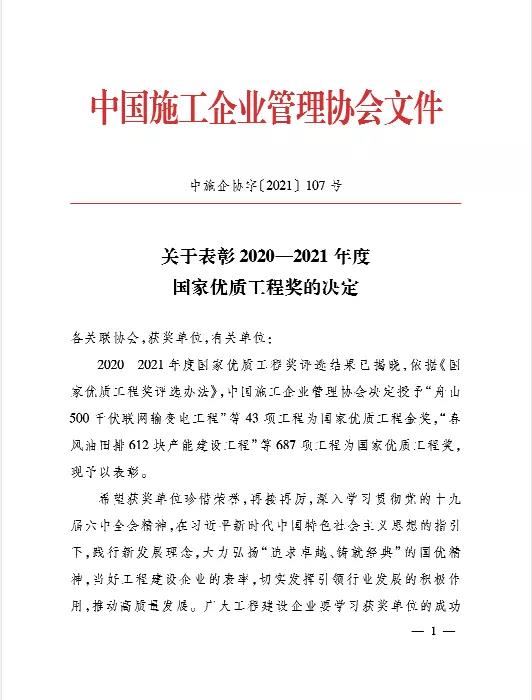 2021年12月6日,2020-2021年度国家优质工程奖评选结果揭晓,公司参建的长江南京以下12.5米深水航道二期工程、恒逸(文莱)PMB石油化工项目荣获国家优质工程奖金奖,京杭运河船闸扩容工程施桥三线船闸工程、富春江船闸扩建改造工程荣获国家优质工程奖! 据悉,国家优质工程奖是由国家工程建设质量奖审定委员会组织审定,冠以“国家优质工程金质奖”、“国家优质工程银质奖”名义的奖项,是工程建设质量方面的最高荣誉。