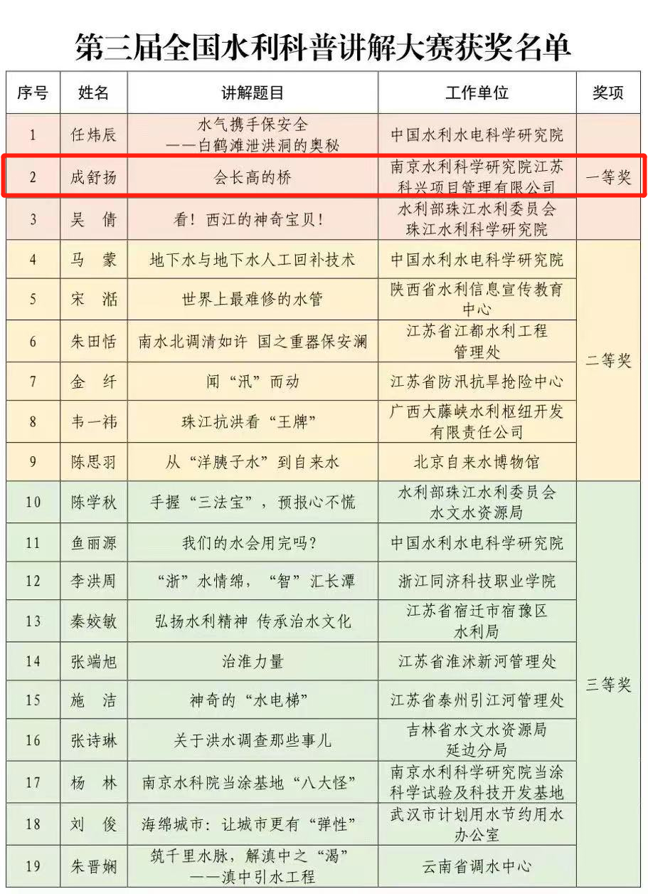近日,由水利部国际合作与科技司指导,水利部宣传教育中心、中国水利水电科学研究院主办,广西大藤峡水利枢纽开发有限责任公司协办的第三届全国水利科普讲解大赛圆满结束。公司员工成舒扬代表南京水科院参赛,经过来自水利部直属单位、省(自治区、直辖市)水利(水务)厅(局)、国家水情教育基地及水利系统全国科普教育基地等62家单位的68名选手的激烈角逐,公司员工成舒扬在比赛中突出重围,获得一等奖的好成绩!