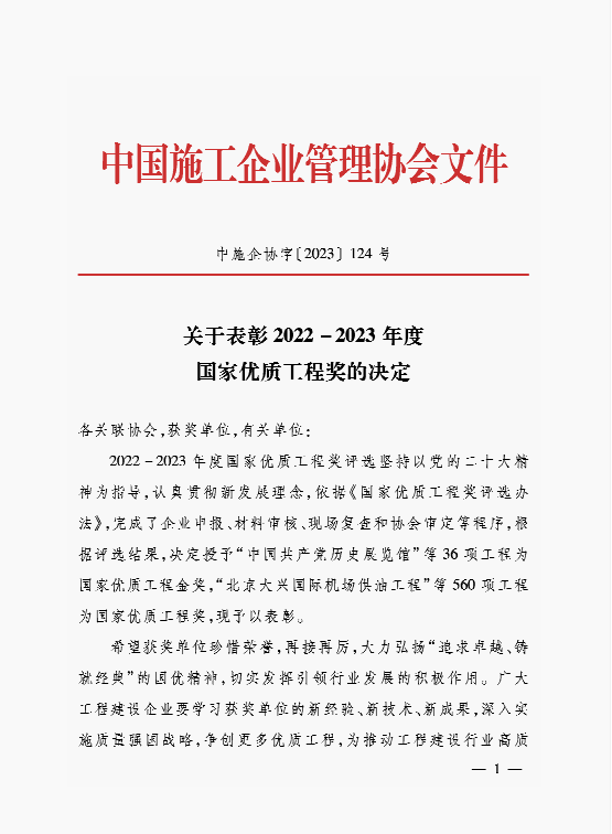据悉,国家优质工程奖设立于1981年,是我国工程建设质量方面跨行业、跨专业的国家级荣誉奖励,是目前经国务院确认的我国工程建设行业设立最早、规格最高的国家级质量奖,国家优质工程金奖为最高奖。该奖项每两年表彰一次,评定涵盖了从工程立项到竣工验收全过程的各个重要程序和环节,在行业内具有示范引领作用,是我国工程建设质量领域奖项的“天花板”。