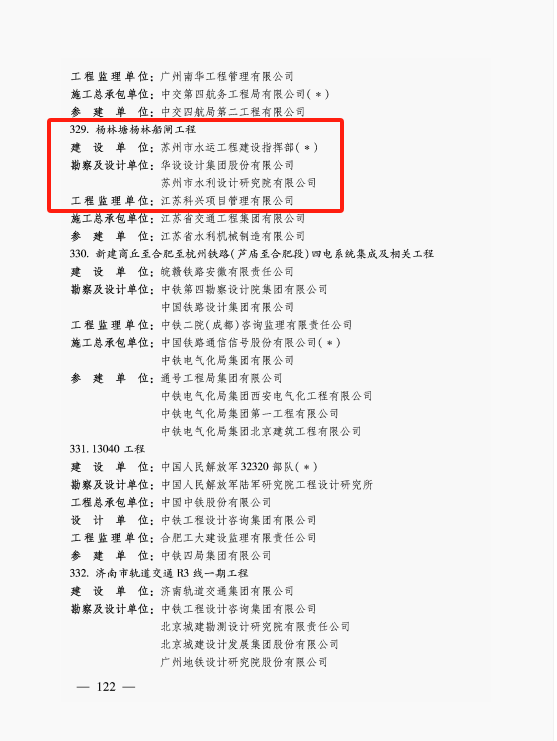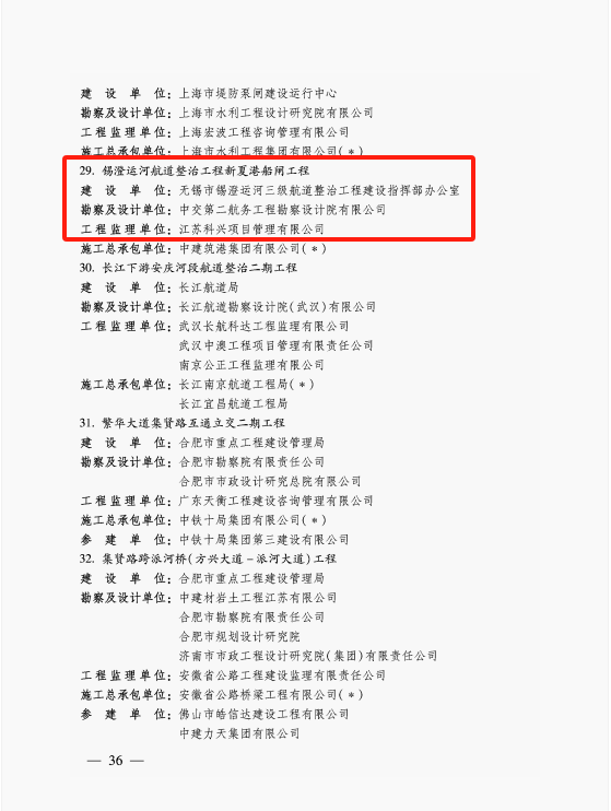 2023年12月9日,中国施工企业管理协会公布了2022-2023年度国家优质工程奖入选名单,公司参建的锡澄运河航道整治工程新夏港船闸工程、杨林塘杨林船闸工程荣获国家优质工程奖!
