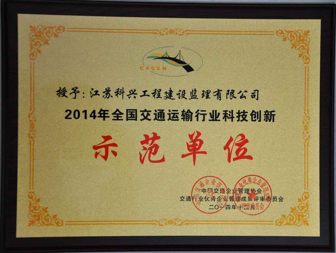 2015410-12日,中国交通企业管理协会2015年交通运输企业科技创新年会在北京召开,此次会议全面总结和展示了交通运输企业科技创新发展水平,会上公布了“2014年全国交通运输企业科技创新成果及示范单位、人物和产品”。在会上,公司被授予“2014年全国交通运输行业科技创新示范单位”,同时公司一人荣获“2014年度全国交通行业科技创新人物”。