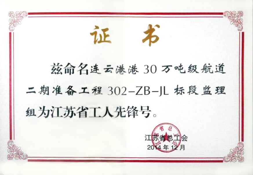 近期从江苏省总工会传来佳讯,由公司承监的连云港港30万吨级航道二期工程准备工程302-ZB-JL标段监理组由于工作表现突出,获得了江苏省总工会颁发的“江苏省工人先锋号”荣誉称号,总监理工程师张齐兴获得了“江苏省五一劳动奖章”的表彰。 连云港港30万吨级航道工程是目前我国乃至世界上在开敞式浅滩淤泥质海岸上建设的等级最高的人工深水航道,是江苏沿海开发的重大基础设施项目。公司前期通过努力,承担了连云港港30万吨级航道二期工程准备工程的标段监理工作,此次该奖项的获得是对公司前期监理工作的肯定;不仅如此,“江苏省五一劳动奖章”的获得更是填补了公司人员获得该奖项的空白。 面对荣誉,公司将戒骄戒躁,再接再厉,在贯彻“科学严谨、公正独立、规范高效、持续改进”质量方针的同时,敢于管理,勇于创新,提高技术服务能力与水平,为我国的工程建设事业做出新的贡献。 (背景资料链接:2011年10月公司获得江苏省科技工会颁发的“工人先锋号”,2011年12月公司施桥三线船闸监理部获得江苏省总工会颁发的“江苏省工人先锋号”。) |