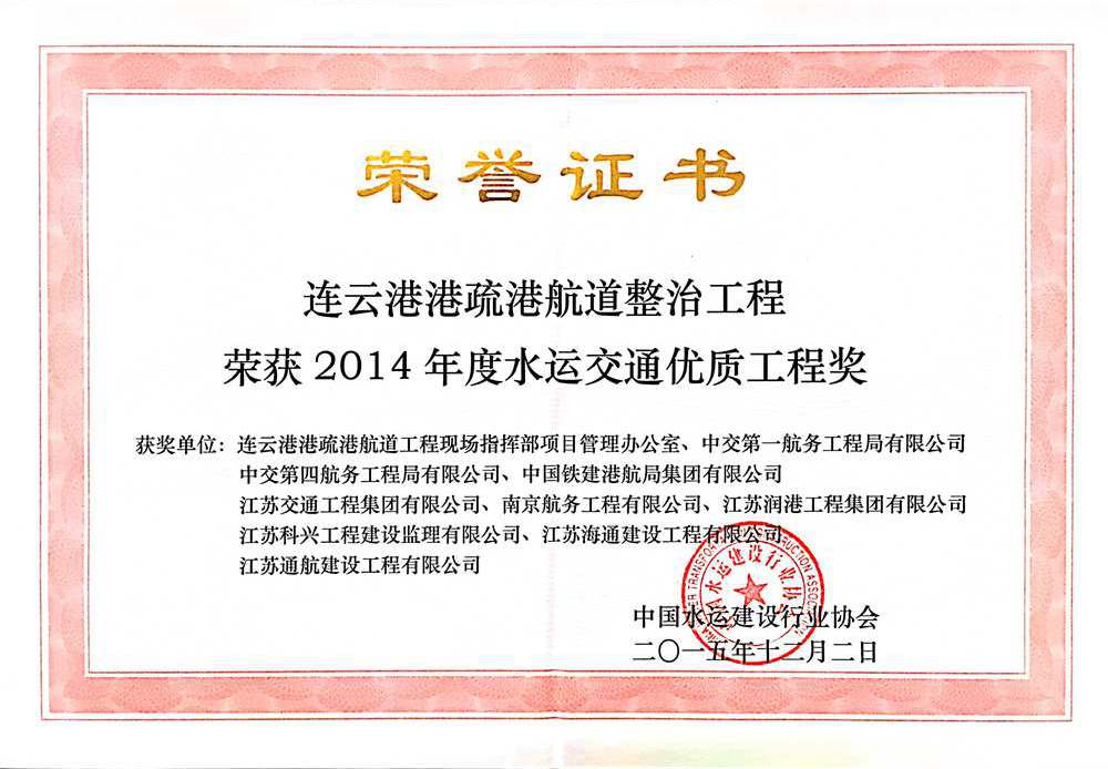 新年伊始,乐鱼官方端网站登录入口喜报频传,公司承监的连云港疏港航道工程在获得交通运输部2014年度水运交通优质工程奖的基础上,又荣获2014-2015国家优质工程奖;舟山大陆连岛工程金塘大桥工程荣获交通运输部2014~2015年度公路交通优质工程奖,南通连申线海安船闸工程荣获交通运输部2014年度公路水运建设“平安工程”称号。此外公司苏州杨林塘航道杨林船闸、无锡锡澄运河新夏港船闸、淮安洪泽淮河出海航道高良涧船闸、扬州高邮通扬线运东船闸等4个船闸工程项目于年底顺利通过交工验收。 多年以来,乐鱼官方端网站登录入口内抓项目质量安全管控,外树品牌监理企业形象,展示名牌服务企业特色,自2010年以来共获国家及省部级工程质量奖15项,荣获行业品牌企业、名牌服务企业等荣誉称号。面对荣誉,公司将戒骄戒躁,进一步加强质量安全管理及内部管控,加强人才队伍建设,做好公司转型升级发展,为南科院繁荣发展添砖加瓦! |