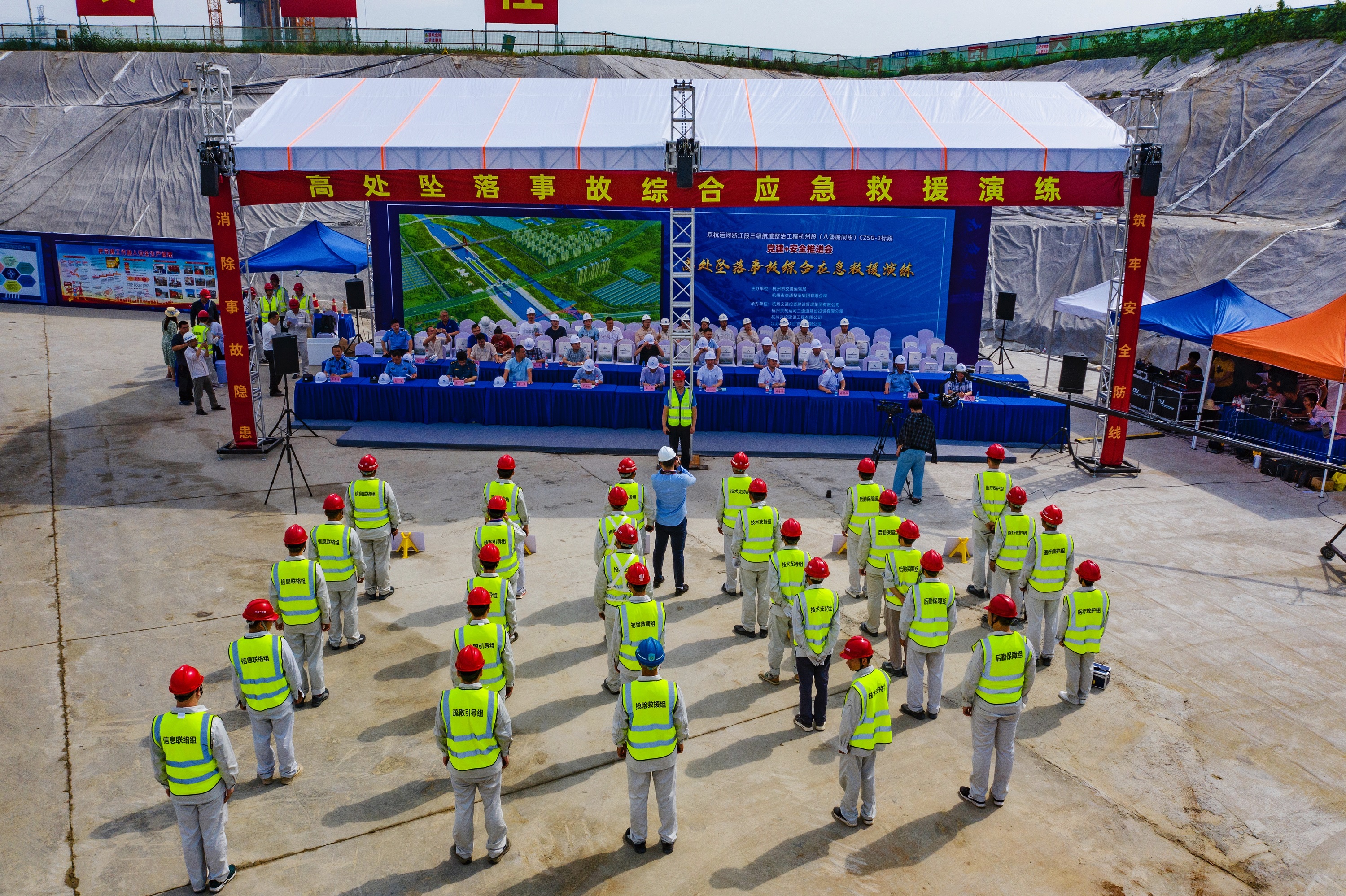 2020年6月是第19个全国安全生产月,京杭运河八堡船闸工程紧扣“消除事故隐患,筑牢安全防线”的活动主题,逐步推动各项安全生产月活动的开展。6月15日,随着应急救援演练总指挥的一声令下,由杭州市交通运输局、杭州市交通投资集团有限公司主办,江苏乐鱼(中国)与工程建设单位、施工单位联合承办的京杭运河八堡船闸工程党建+安全高处坠落事故综合应急救援演练正式拉开序幕。