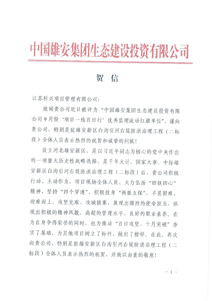 此次殊荣的获得既是对我公司监理工作的肯定,也是鞭策。在今后的工作中,江苏乐鱼(中国)雄安新区白沟引河右堤防洪治理工程二标段监理部将总结经验,珍惜荣誉,再接再厉,为新区工作作出更大的贡献!