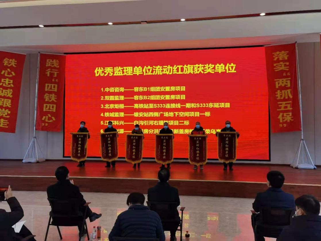 2021年1月10日上午,雄安集团在容东片区中铁建设项目部组织召开推进部署雄安集团及建设工地一线疫情防控工作会议,会议总结“十月突破一线行”活动阶段性成果,同时对十一、十二月份流动红旗获奖单位进行表彰。